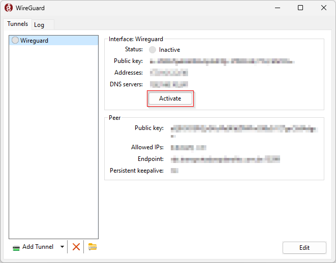 A conexão VPN será importada e exibida na janela principal do WireGuard.